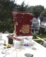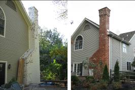 Water damaged chimney that was exaggerated by latex paint trapping water into the brick. Rebuilt as needed and replace mortar top with stronger concrete top. |