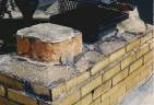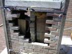 Water damaged chimney caused by dummy flues, a cracked mortar top, and corbelling causing water to infiltrate brick. Rebuild with no corbelling and a concrete top over chimney. |