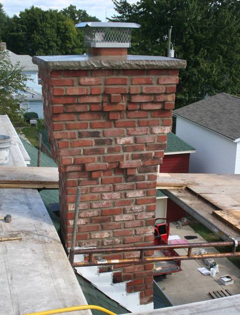 deteriorated severely eventually causing debris to fall from the chimneys. Although the chimneys had been patched several times it was not enough to stop the further erosion of brick; therefore, it was necessary for all three to be completely rebuilt. We were able to comply with the property owner’s requests, by keeping the look of a home in the 1800’s and provide them with a solid, simulated sand stone concrete top that will withstand the tests of time. We are proud to be one of the few companies in the area to offer this type of concrete top. When the homeowner was asked if she was pleased with the job; she replied, “I never thought a chimney could be beautiful.” |