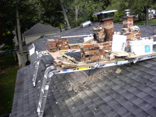 Water damaged chimney caused by dummy flues, a cracked mortar top, and corbelling causing water to infiltrate brick. Our advice; rebuild with no corbelling and a concrete top over chimney. |