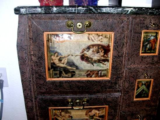 that is covered in simulated hand tooled leather with drawer faces inlaid with pictures of Michelangelo’s frescos from the ceiling of the Sistine Chapel. With the brushed brass locks and hardware, and maple trim, this piece looks as though it is has been around long enough, Michelangelo himself may have crafted it. |