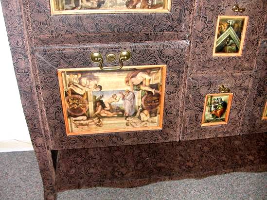 that is covered in simulated hand tooled leather with drawer faces inlaid with pictures of Michelangelo’s frescos from the ceiling of the Sistine Chapel. With the brushed brass locks and hardware, and maple trim, this piece looks as though it is has been around long enough, Michelangelo himself may have crafted it. |