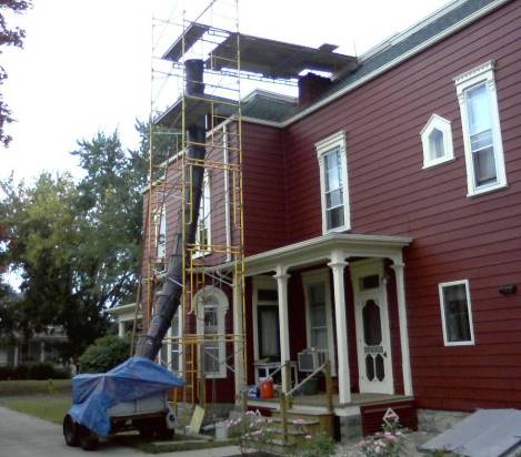 deteriorated severely eventually causing debris to fall from the chimneys. Although the chimneys had been patched several times it was not enough to stop the further erosion of brick; therefore, it was necessary for all three to be completely rebuilt. We were able to comply with the property owner’s requests, by keeping the look of a home in the 1800’s and provide them with a solid, simulated sand stone concrete top that will withstand the tests of time. We are proud to be one of the few companies in the area to offer this type of concrete top. When the homeowner was asked if she was pleased with the job; she replied, “I never thought a chimney could be beautiful.” |